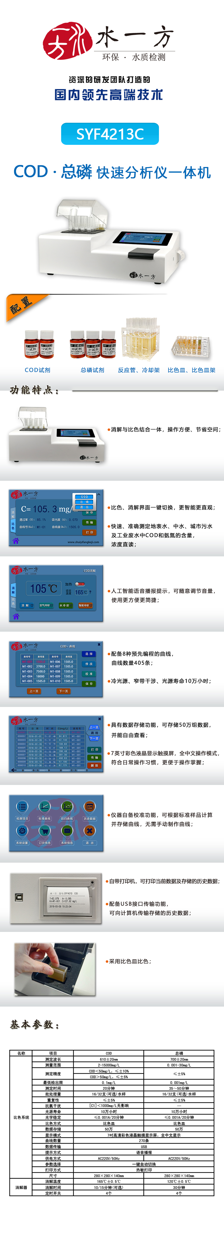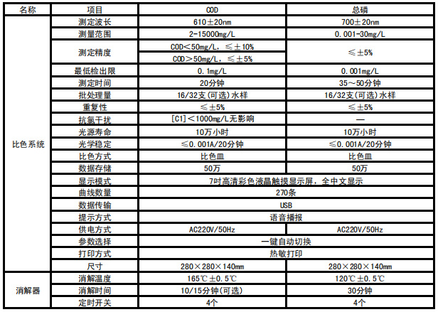 (01)消解与比色结合一体,操作方便、节省空间;(02)比色、消解界面一键切换,更智能更直观;(03)快速、准确测定地表水、中水、城市污水及工业废水中COD和总磷的含量,浓度直读;(04)人工智能语音播报提示,可随意调节音量,使用更方便更简捷;(05)配备8种预先编程的曲线,曲线数量405条;(06)冷光源、窄带干涉、光源寿命10万小时;(07)具有数据存储功能,可存储50万组数据,并能自由查看;(08)7英寸彩色液晶显示触摸屏,全中文操作模式,符合日常操作习惯,更便于操作掌握;(09)仪器自备校准功能,可根据标准样品计算并存储曲线,无需手动制作曲线;(10)自带打印机,可打印当前数据及存储的历史数据;(11)配备USB接口传输功能,可向计算机传输存储的历史数据;(12)采用比色皿比色;