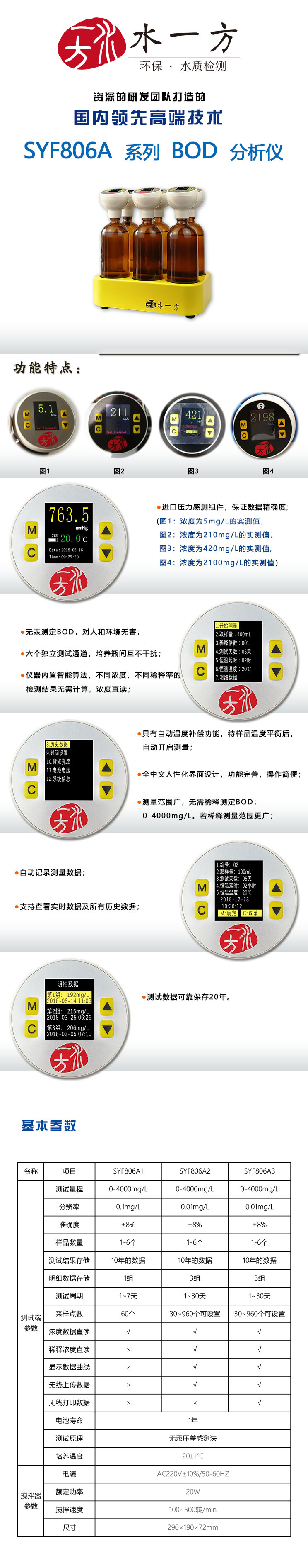 (01)无汞测定BOD,对人和环境无害(02)六个独立测试通道,培养瓶间互不干扰(03)进口压力感测组件,保证数据精确度(04)仪器内置智能算法,不同浓度、不同稀释率的检测结果无需计算,浓度直读(05)全中文人性化界面设计,功能完善,操作简便(06)测量范围广,无需稀释测定BOD:0-4000mg/L。若稀释测量范围更广(07)具有自动温度补偿功能,待样品温度平衡后,自动开启测量(08)自动记录测量数据,记录频率可选择,自动绘制数据分析曲线并保存(09)支持查看实时数据及所有历史数据(10)测试数据可靠保存20年