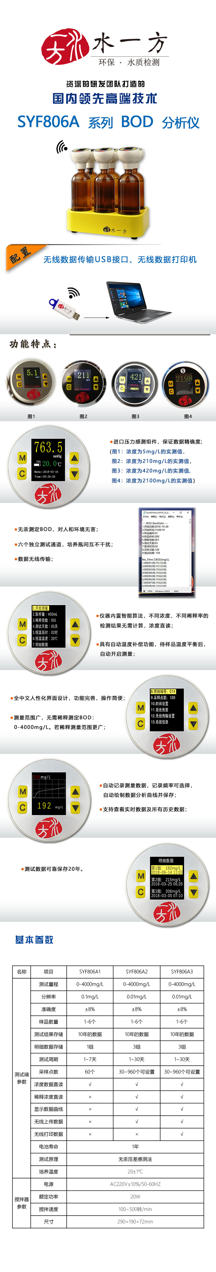 (01)无汞测定BOD,对人和环境无害(02)六个独立测试通道,培养瓶间互不干扰(03)数据无线传输(04)进口压力感测组件,保证数据精确度(05)仪器内置智能算法,不同浓度、不同稀释率的检测结果无需计算,浓度直读(06)全中文人性化界面设计,功能完善,操作简便(07)测量范围广,无需稀释测定BOD:0-4000mg/L。若稀释测量范围更广(08)具有自动温度补偿功能,待样品温度平衡后,自动开启测量(09)自动记录测量数据,记录频率可选择,自动绘制数据分析曲线并保存(10)支持查看实时数据及所有历史数据(11)测试数据可靠保存20年